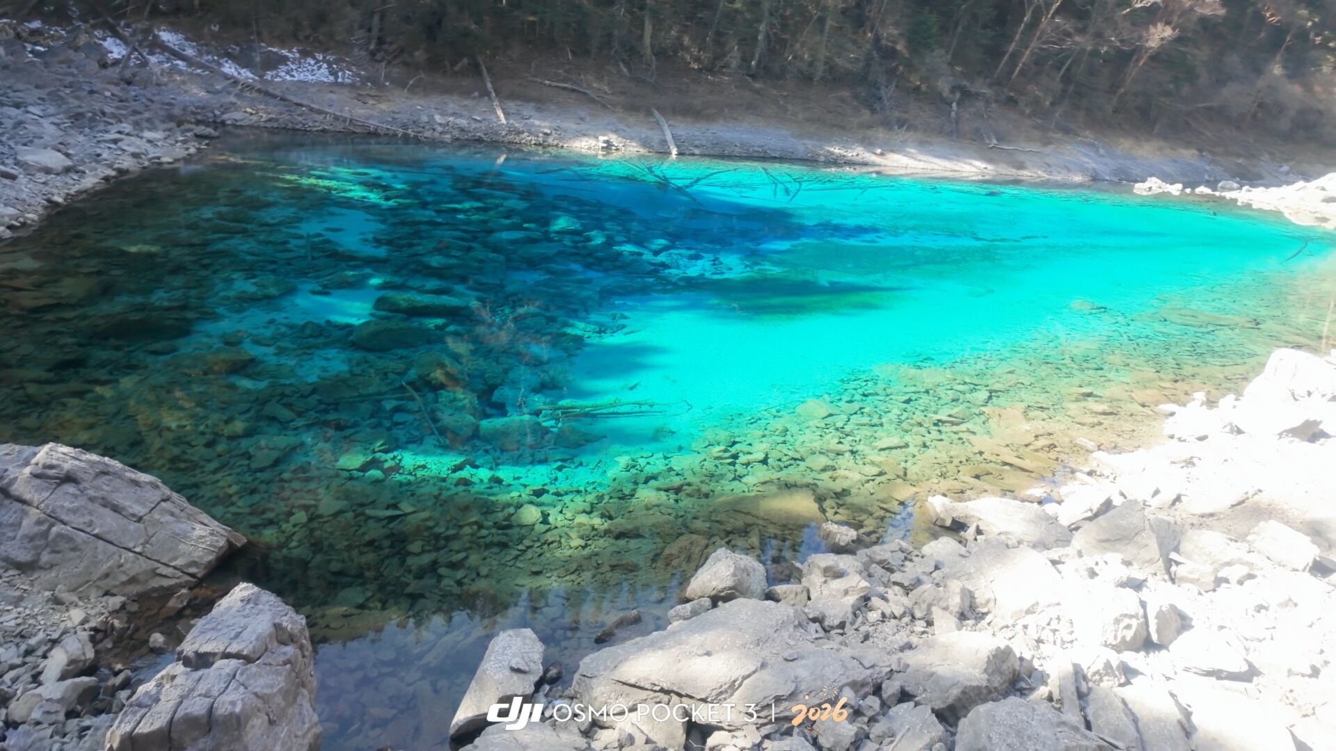 九寨沟最让我震撼的,莫过于五花海与五彩池。曾在电视见过五彩斑斓的九寨沟,以为是后期滤镜加持,而亲眼所见,更为震撼。虽然是冬天,有部分结冰,并没有真的“五彩”,但水清澈见底,若非清风阵阵,确有“皆若空游无所依”之感;水底的矿石与高低差异,又为水带来了蓝、青、绿三色,犹如大自然的调色盘;艳阳高照,清风微拂,波光粼粼。