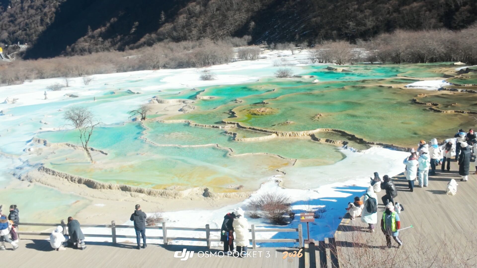 黄龙不似九寨沟,许多池子都已结冰,少数几个池子泛着绿波,周边许多树木也已黄枯。但黄龙胜在高,能见度也高,两侧的山非常陡峭,但都离栈道有不少距离。与平原的山不同,走在栈道上,眼前非常开阔、辽远,令人心情愉悦。一路而下,虽然能见到不少清澈鲜艳池子,但都与九寨沟大同小异,再见时震撼感已少了许多。而结冰的部分都附在白色与黄色的钙华上方,水流化时应是另一番独特美景。